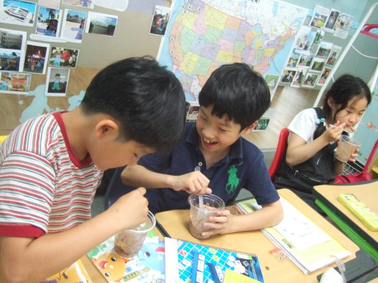 This week in class we made worm cups, and the kids LOVED it! In a cup you put chocolate ice cream for the mud (usually you use pudding but I couldn't find that in Korea) then add crushed up oreos for the dirt