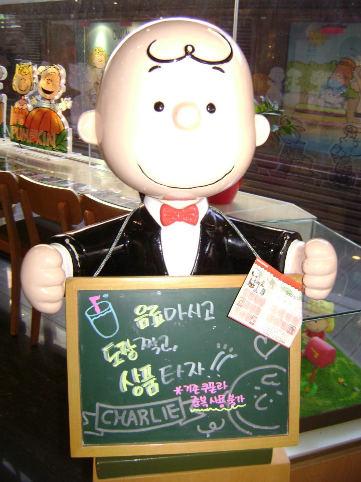 Just like the Hello Kitty Cafe the Charlie Brown Cafe is located on the Green Line at Hongik University Station.